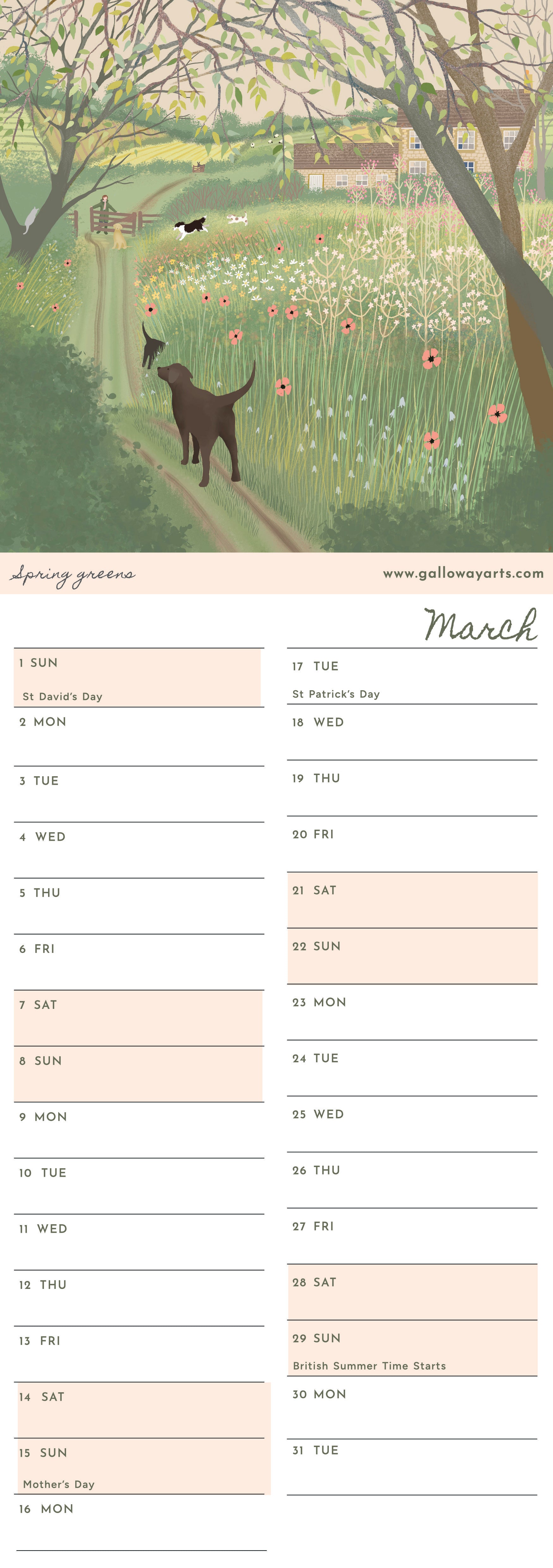 Our calendars are 149 x 420 mm with a thumb-cut and a hanging loop.